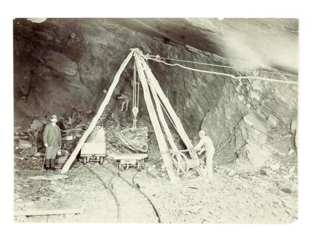 Photograph showing showing a group of ten quarrymen at Dinorwig Quarry. The quarrymen are stood in front of the rockface. Standing with the quarrymen is an unidentified woman, wearing a dress, hat, and holding an umbrella. It is believed she is visiting the quarry.