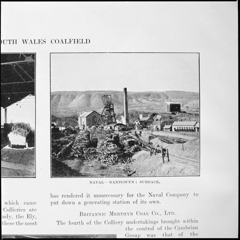 Black and white film negative of a postcard showing a general surface view of Naval Colliery. The bottom of the postcard reads 'Naval Colliery, Trealaw' . 'Naval' is transcribed from original negative bag.