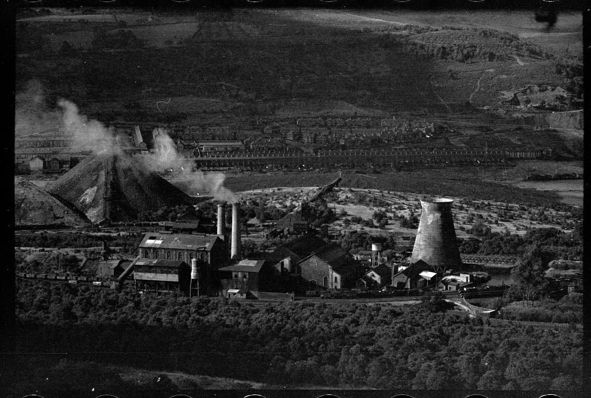 Black and white film negative of Upper Boat power station, c1940. Shows three workmen during construction of power station.
