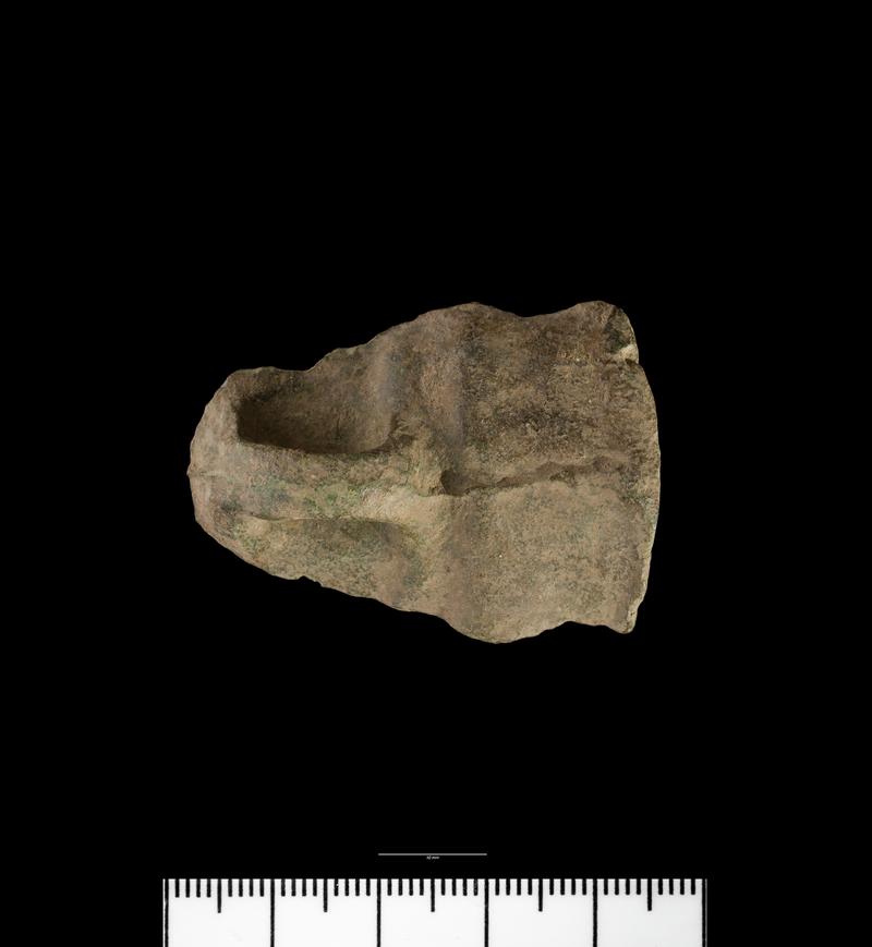 Ribbed socketed axe - probably South Wales Type. Large fragment of a ribbed socketed axe, missing one side, mouth and loop. The axe has straight and slightly divergent sides, with slight expanding at the blade end. The axe has a blocky and rectangular shaped body in cross-section, and angled face edges, with a prominent out-splayed mouth moulding. Three convergent ribs descend from the underside of the prominent mouth moulding on the surviving face, and extending down three quarters of the surviving length of the blade. On the opposite face, the ends of three ribs can be seen just below the break point. The casting seams are visible down both sides of the axe, through were hammered down, while a lower loop stub survives on one side. Slight denting to the blade surface, just below the break on one side hints at the possibility that this axe may have been broken through hammering prior to burial and the break edges here are non-eroded and soil covered. Large parts of the face have a black surface patina, possibly deliberately coloured and applied by the makers. The lower blade has a grey-green patina, while the blade edge and parts of the mouth have powdery light-green eroded surfaces. On the mouth, one small area of break shows exposed and fresh bronze, suggesting the mouth was clipped and accidentally broken by the finder during its retrieval.
