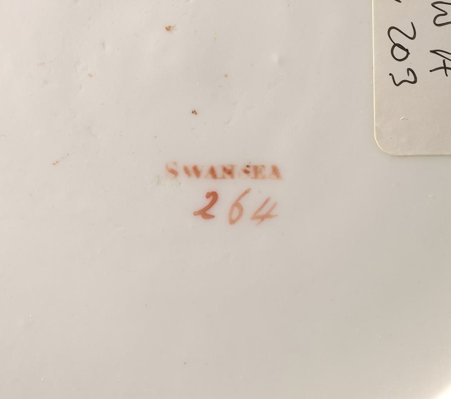 Plate, soft-paste porcelain; foot rim curving into straight spreading sides; painted with a wide border of sponged green enamel, with four gilt-outlined oval reserves of birds perched on branches ( one brown, the others polychrome ); an inner gilt border of arcades with three-petaled pendants; a gilt circular band in the centre, and a gilt band to the lip.