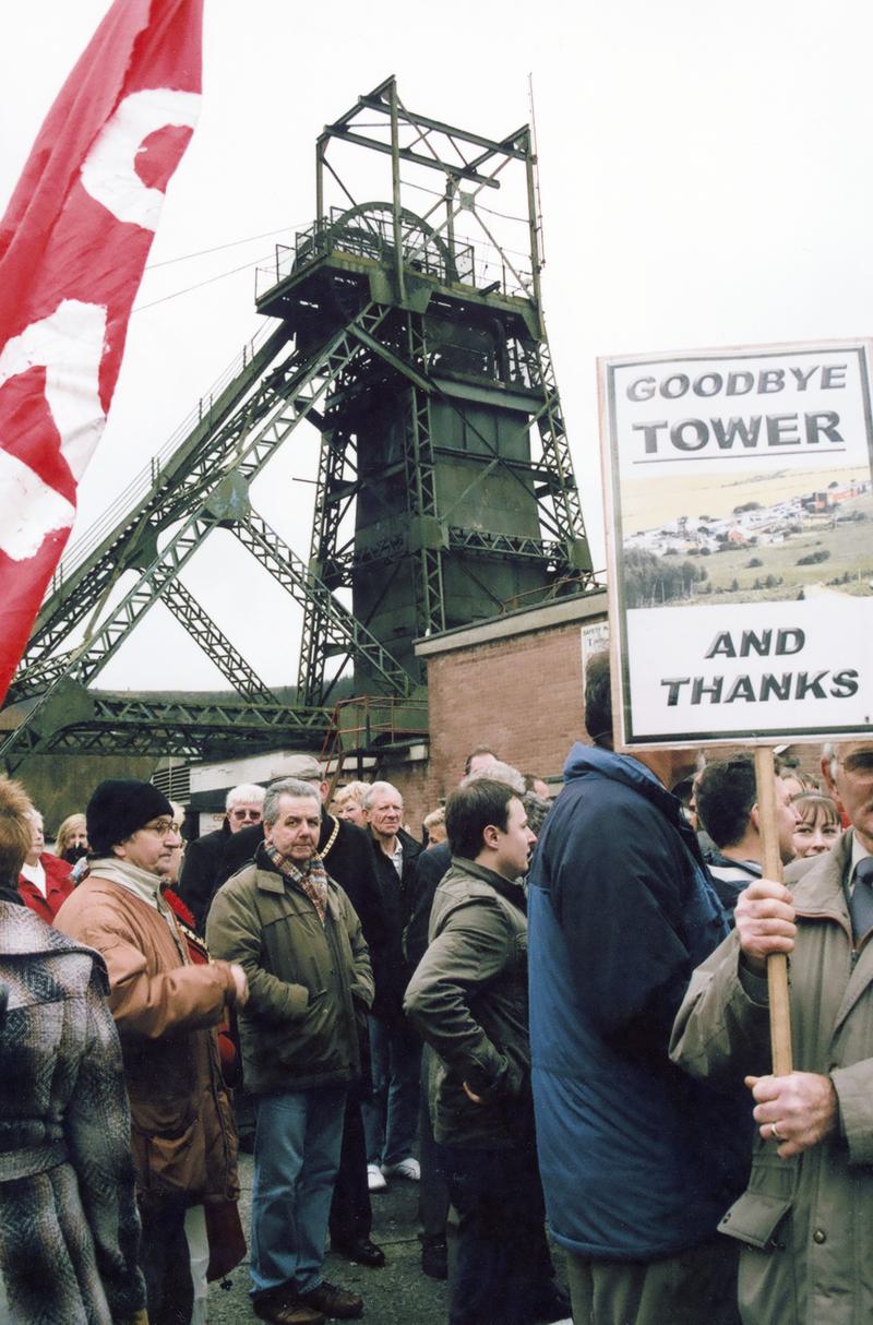 Closure of Tower Colliery, Hirwaun, showing the march away from Tower Colliery. Four people at centre (linking arms) are Dai ('Dosco') Davies (fitter), Ann Clwyd (MP for the Cynon Valley), Will Diver (Tower Lodge Secretary), and Violet John (political activist). On the extreme right in his working clothes is John Woods (Tower overman).