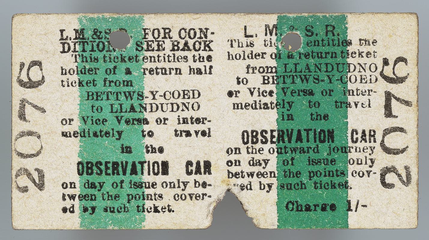 Black print on blue and cream card. L. M. & S. R. ticket (single journey) to travel in observation car - Llandudno to Blaenau Festin'g (sic). Ticket number 1857.
