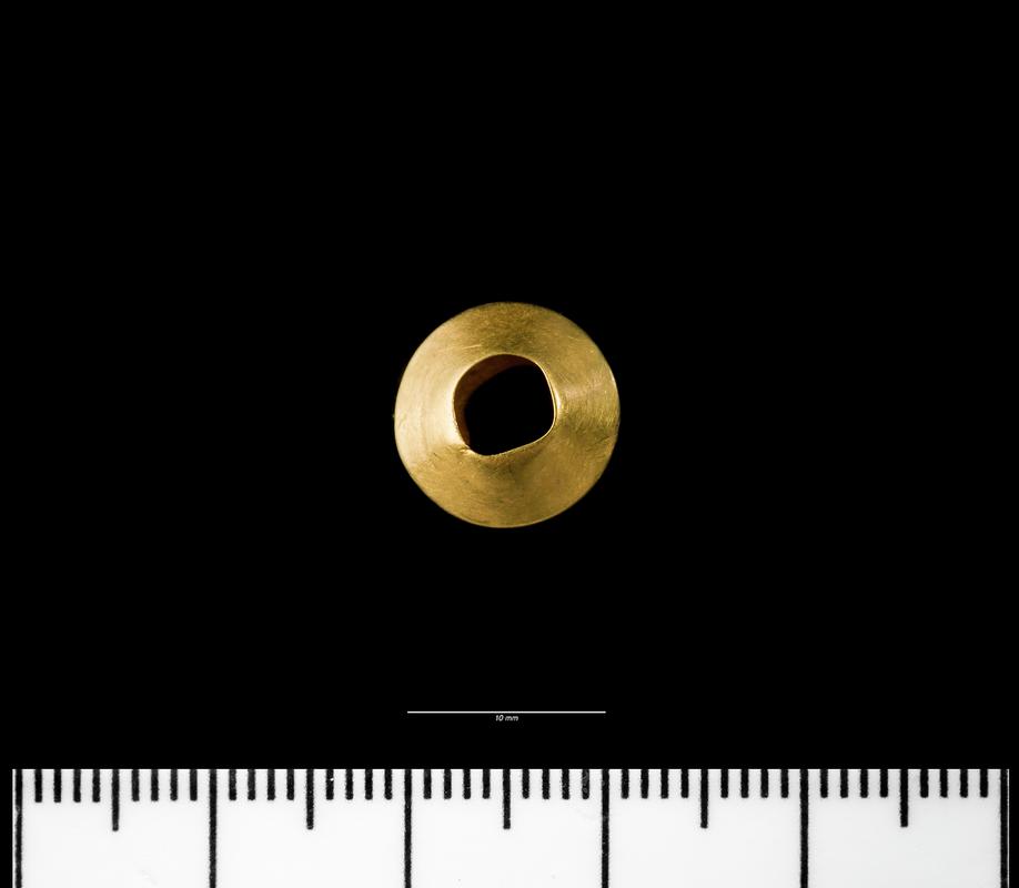 Biconical gold bead, 1300-1150 BCE. Wales was at the heart of a tradition of gold-working in Atlantic Europe during the Middle Bronze Age. This biconical gold bead was among objects found at Burton near the River Alun.