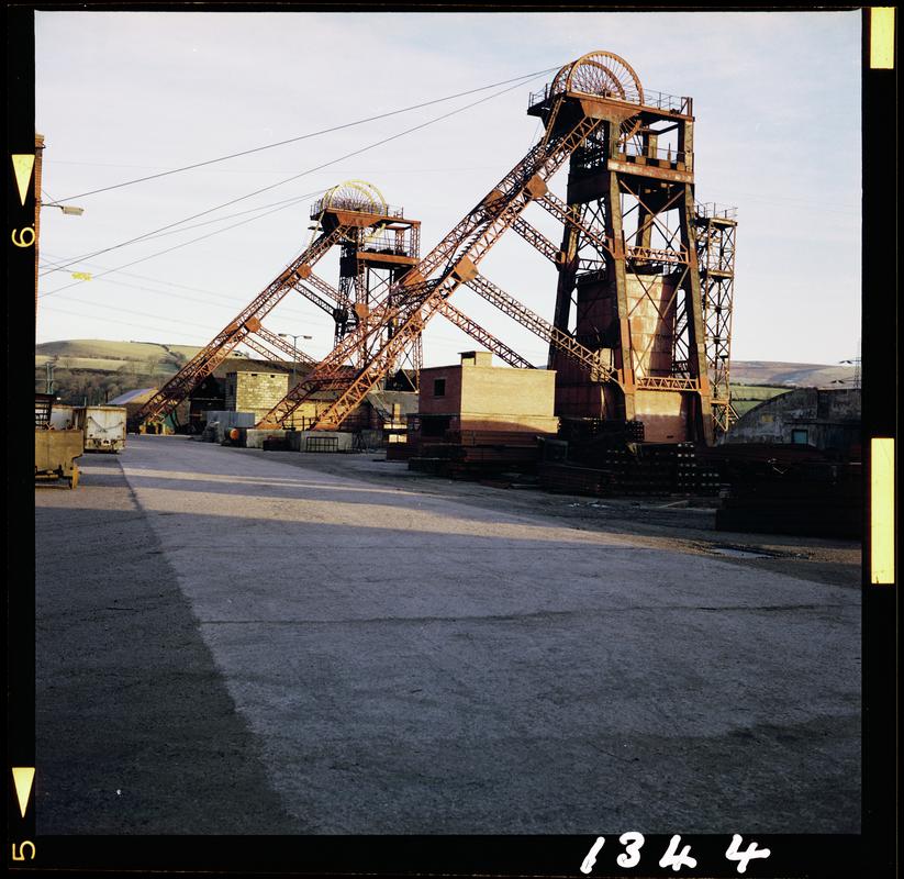 Black and white film negative showing men at pit top, Morlais Colliery 13 May 1981. 'Morlais 13/5/81' is transcribed from original negative bag.