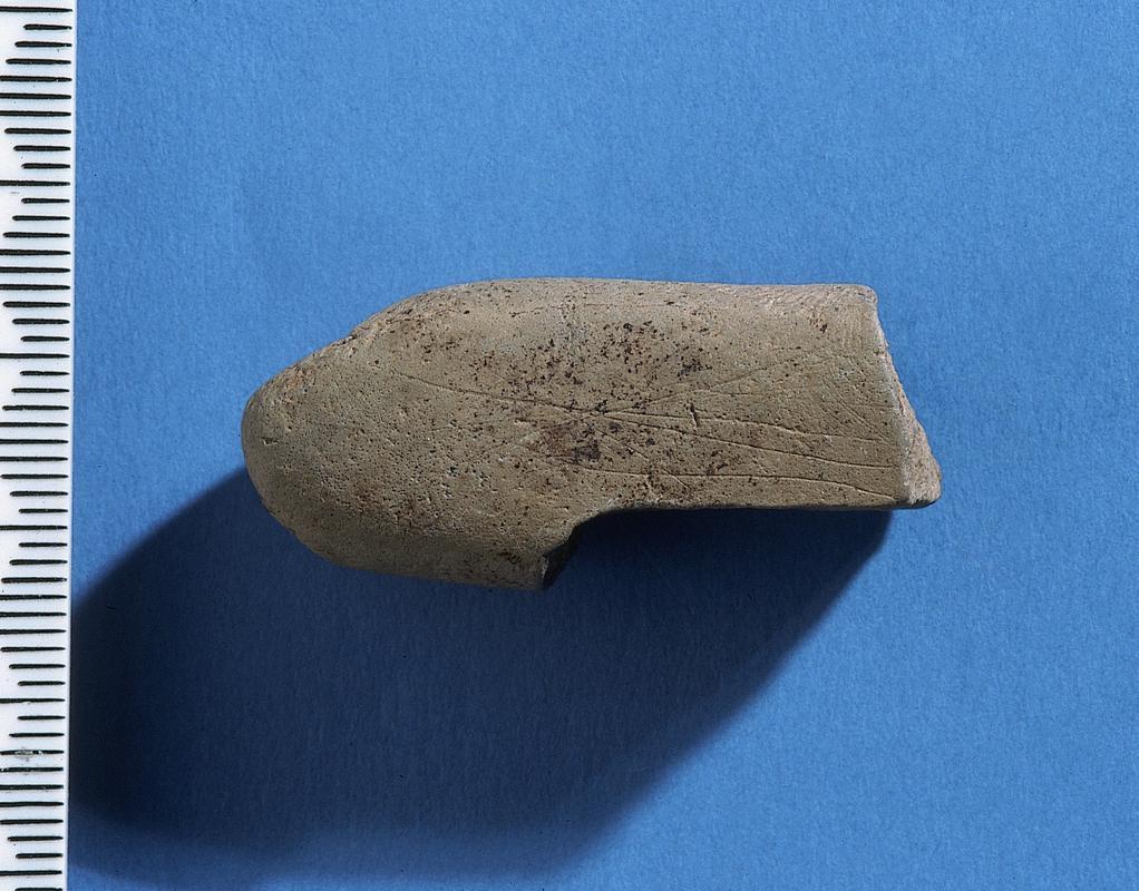 From Romano-British Soil M64a, This is a slightly micaceous sandstone with far more silt, and therefore finer-grained than the others. It is the broken end of a thin pebble decorated only on one of the broad faces with a series of criss-cross lines which roughly follow three main orientations. As the piece is fragmentary with some surface damage, analysis of the design and the identification of motifs is not possible.
