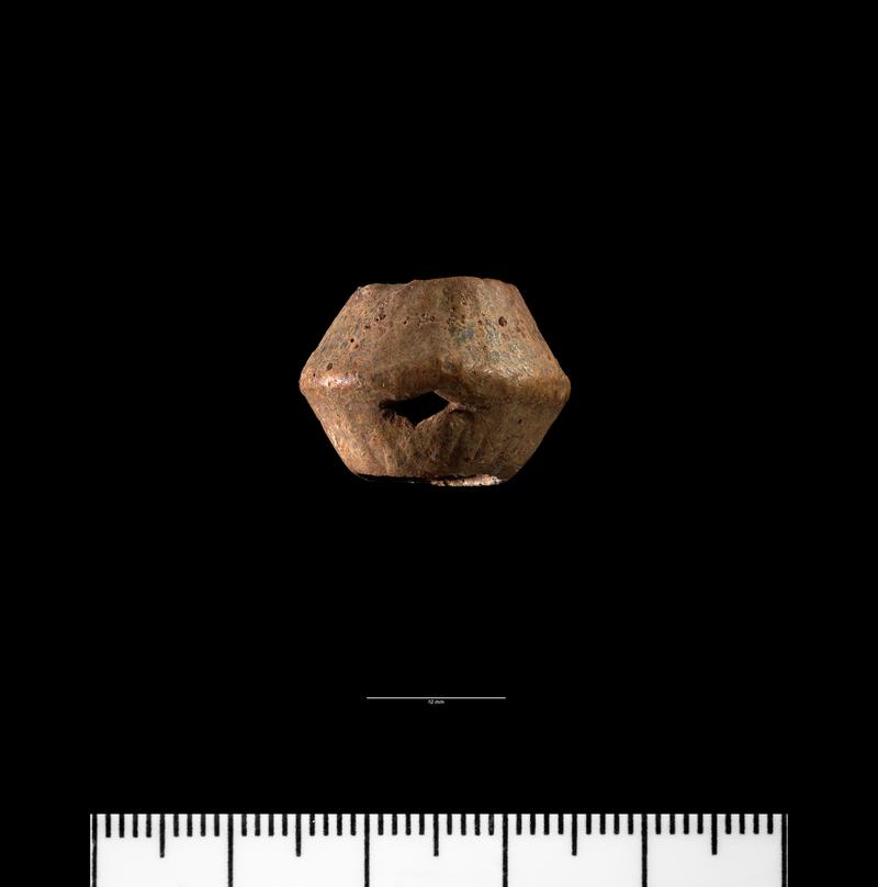 Disc shaped spindle whorl with rounded edges and large central perforation surrounded on both faces by a continuous incised line. The edges are quite worn and battered.
