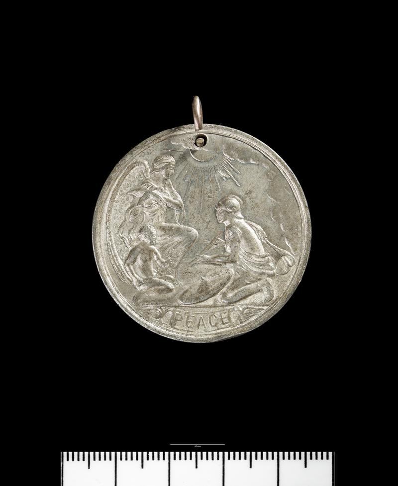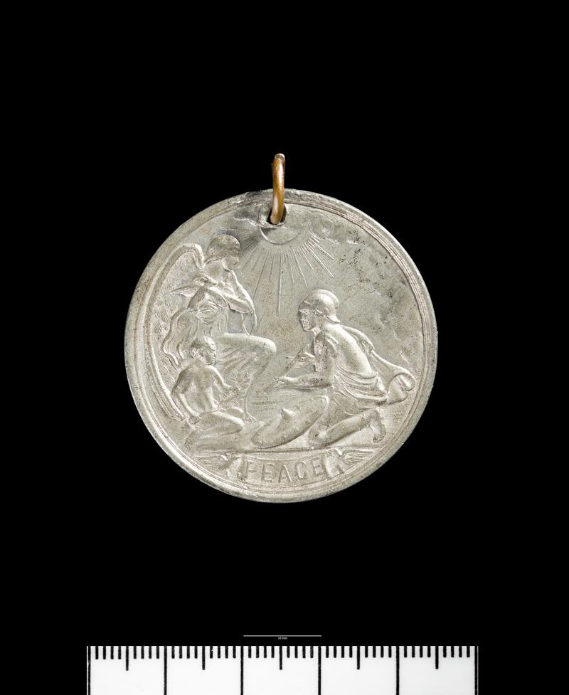 Medal, partly mis-shapen and with three round holes. With an illustration of a fountain on obverse and inscription on reverse: IN COMMEMORATION OF THE UNVEILING OF THE PUBLIC FOUNTAIN PONTYPRIDD THE GIFT OF ALFRED THOMAS M.P. OCT 3rd 1895.