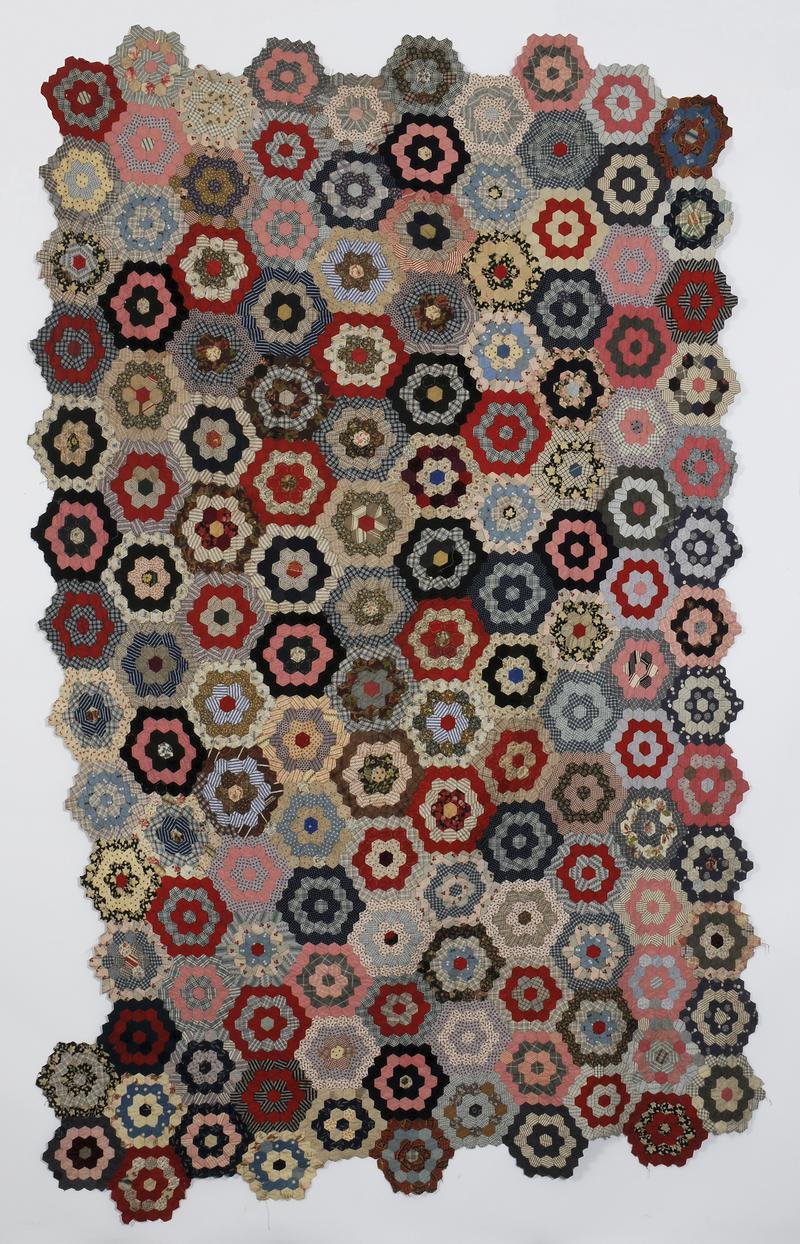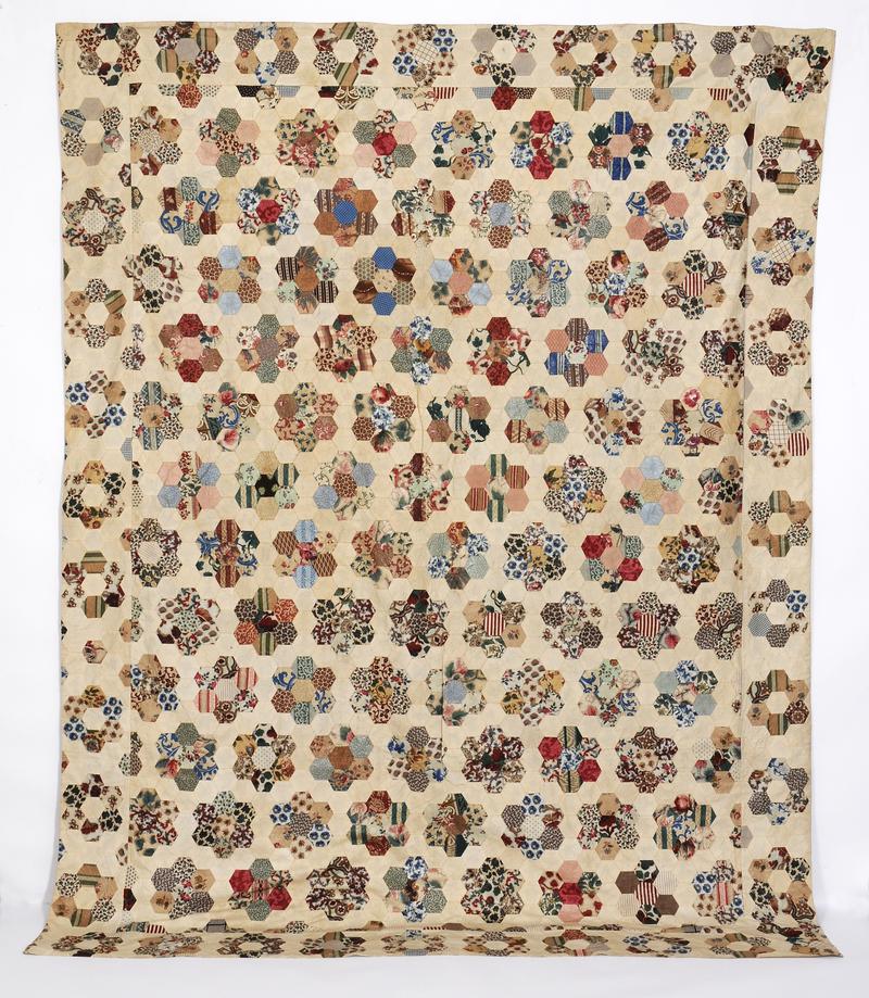 Velvet and silk crazy patchwork bedcover. Made in 1895 by Mrs Ann Jenkins of Croston, Roose, for her daughter whose name is embroidered on it. Blue border embroidered in yellow, with inner border of stamped black velvet on three sides (one side covered with yellow embroidery). Green cotton sateen lining. Inscription in corner: C.J.Jenkins Roose X 1895.