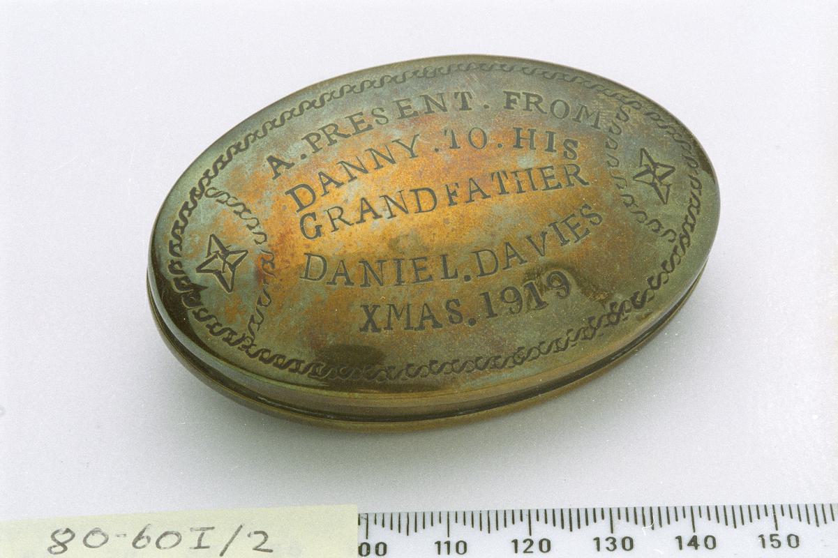 Brass oval twist box with inscription and stamped decoration on top hinged lid.