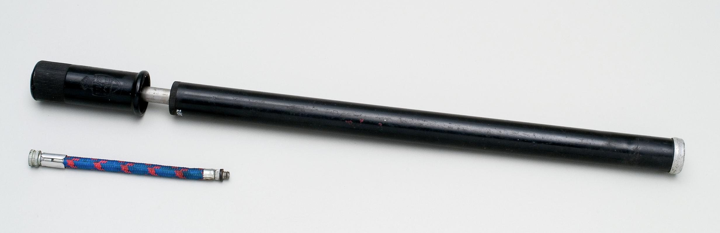 Bicycle pump for bicycle used by the late Tommy Letton, Butetown fishmonger 1930's - 1950's. Aluminium base with dark brown plastic coating with hole in handle to house bicycle pump adaptor.