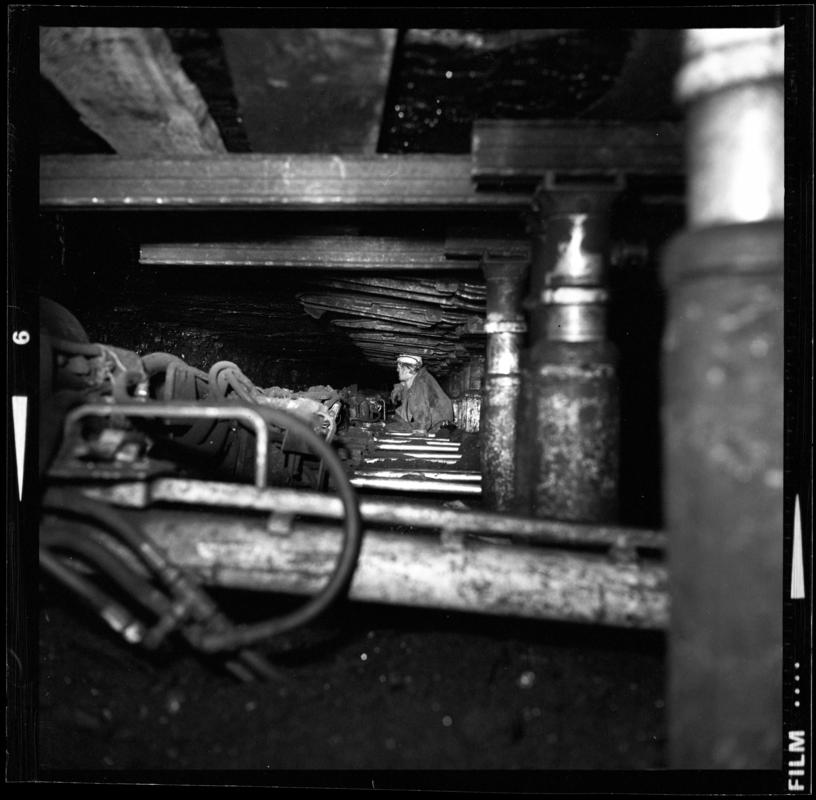 Black and white film negative showing a chain hauled shearer at work in poor conditions on a prop bar face, Coegnant Colliery. Note the timber and additional steel work needed to hold the roof.