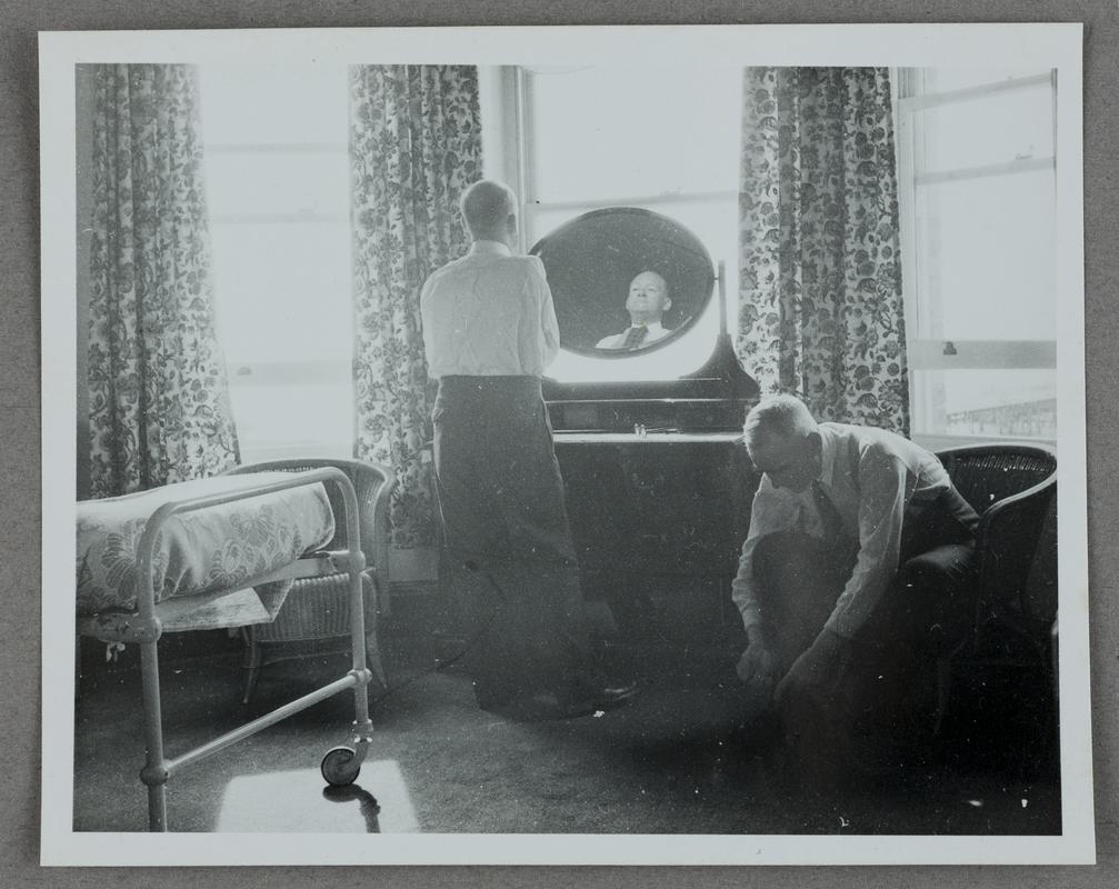Handwritten note in red ink on paper relating to badges 2016.43/40-44. Dated 3 Feb 1942.