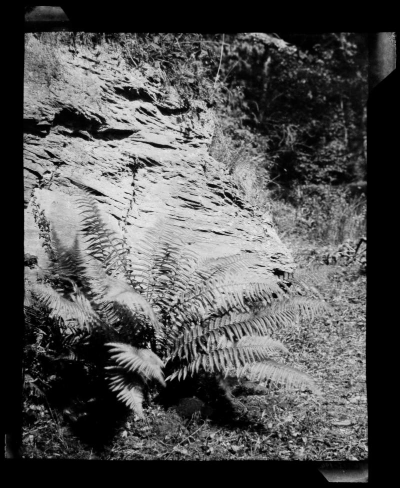 Calotype negative showing ferns at end of Upper Lake at Penllergare. Tabs on all corners except top left.