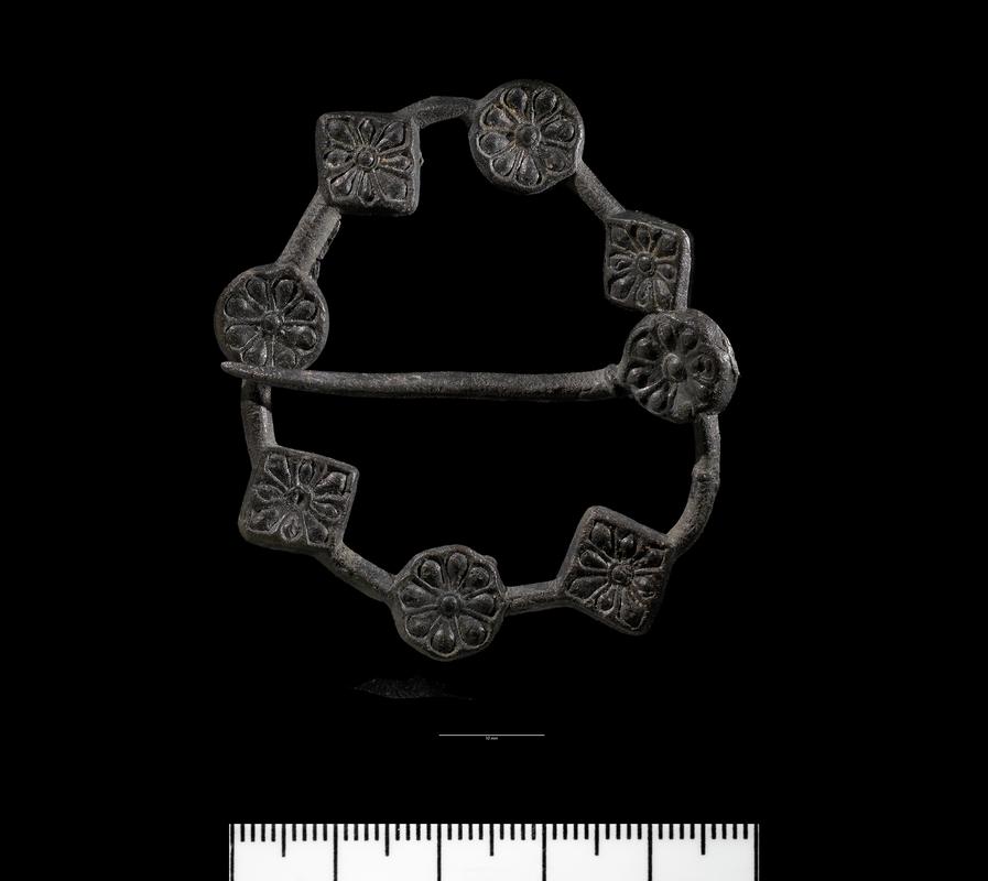 The necklace, made of a white metal (pewter?) decorated with pendant leaves alternating with small bells and ending with a pendant horn, the symbol of pilgrimage.