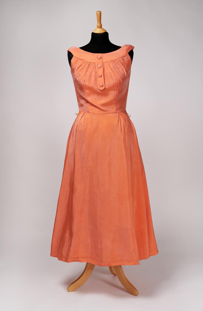 Single-breasted suit jacket of stone coloured wool with 2-button fastening (only the lower button [brown plastic] remaining). The fabric of the jacket is of a fine 2/1 twill weave of grey wefts (2-ply, S-twist, 24/cm) and warps made of lengths of brown and beige plied togethe (2-ply, S-twist, 35/cm). There is a supplementary pattern of a fine check achieved by pairs of additional warps and wefts, resulting in c.3.2cm wide squares. In the centre of each square is a set of three warps made of knop yarn, which has an additional component of blue fibres, which are bunched up at c.10.5cm intervals resulting in small specks of blue across the fabric.