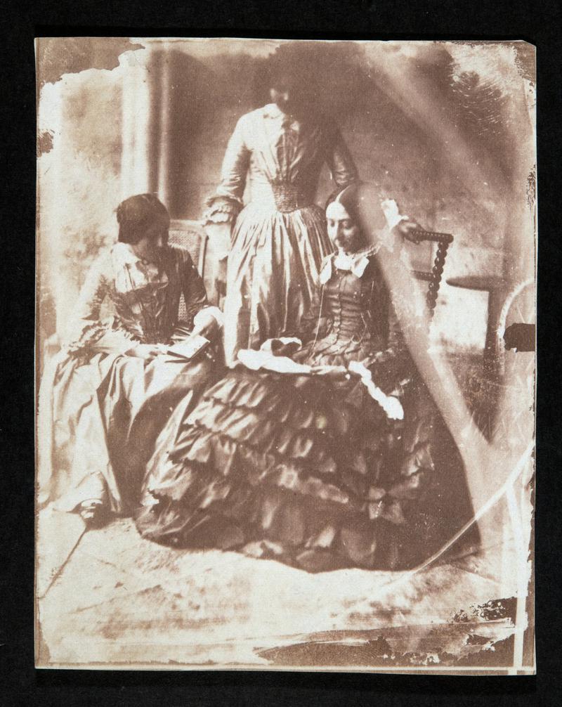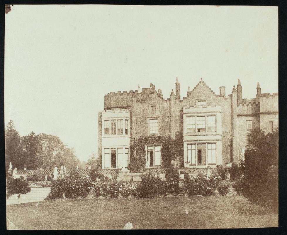 Mounted salted paper print. View of garden with wheelbarrow and broom on pathway in centre. Mounted on cream card and black / brown ink frame to photographic print.
