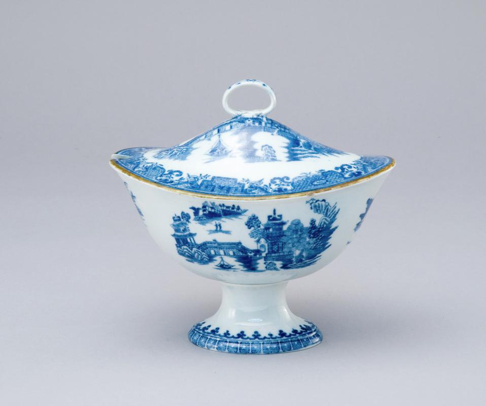 Shallow circular sauce tureen on a pedestal base. Flat circular cover; two handles (one restored), and finial in shape of butterflies with outstretched wings, gilt. Body of tureen and cover, embossed with white flowers and foliage on a pale pink ground. Around upper section of tureen, four arrangements of garden flowers in polychrome enamels against a white ground. Gilt rims.