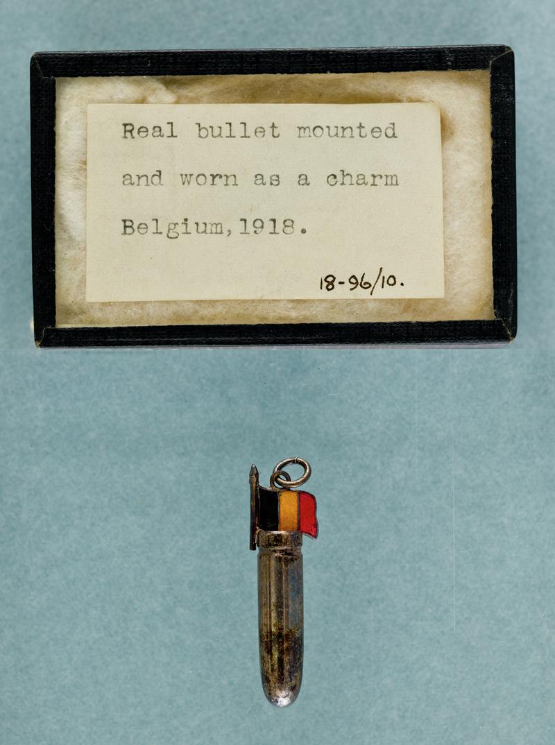 Amulet in a box, with a typed note: 'Shoe Charm carried for safety by a man of the Devonshire Regt. 1917'. Acquired by the Museum in 1918 from Edward Lovett, a folklorist and collector from Croydon.
