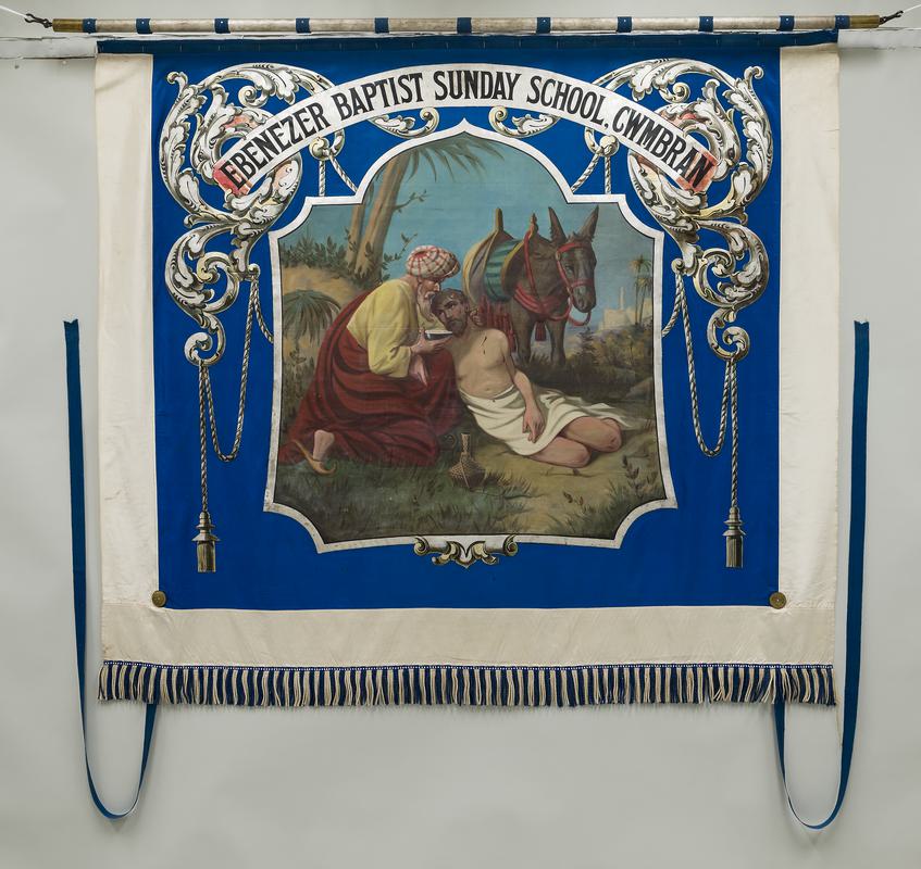 President's chain of office of Cardiff & District Sunday School Union; consisting of 35 small medallions, all inscribed with Presidents' names from 1933-1967, mounted blue ribbon; with Union badge at front; in box.
