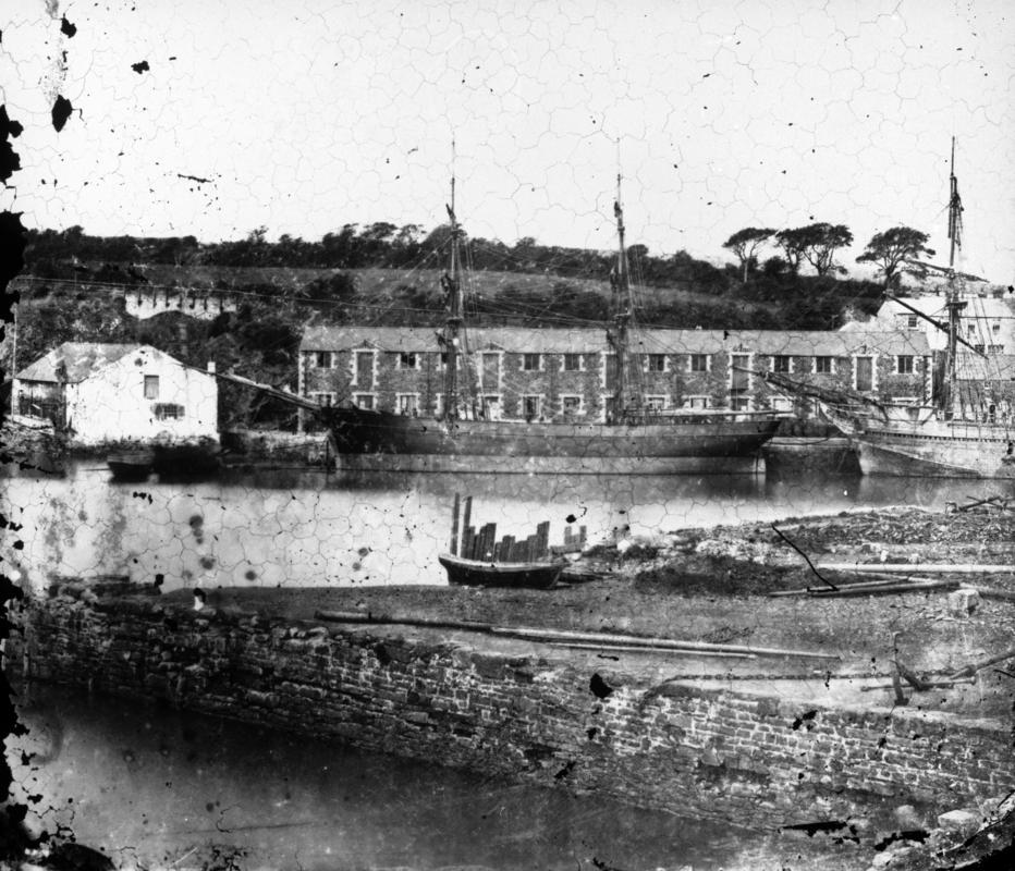 View of a brig infront of a long row of terraced buildings, Milford Haven. Similar to 1998.209/2.