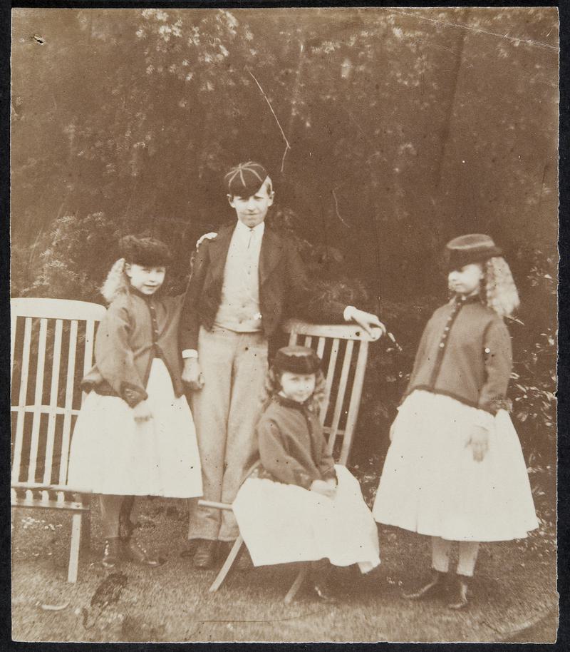 Salted paper print. Group of four girls and a toy cart. All corners have been clipped.
