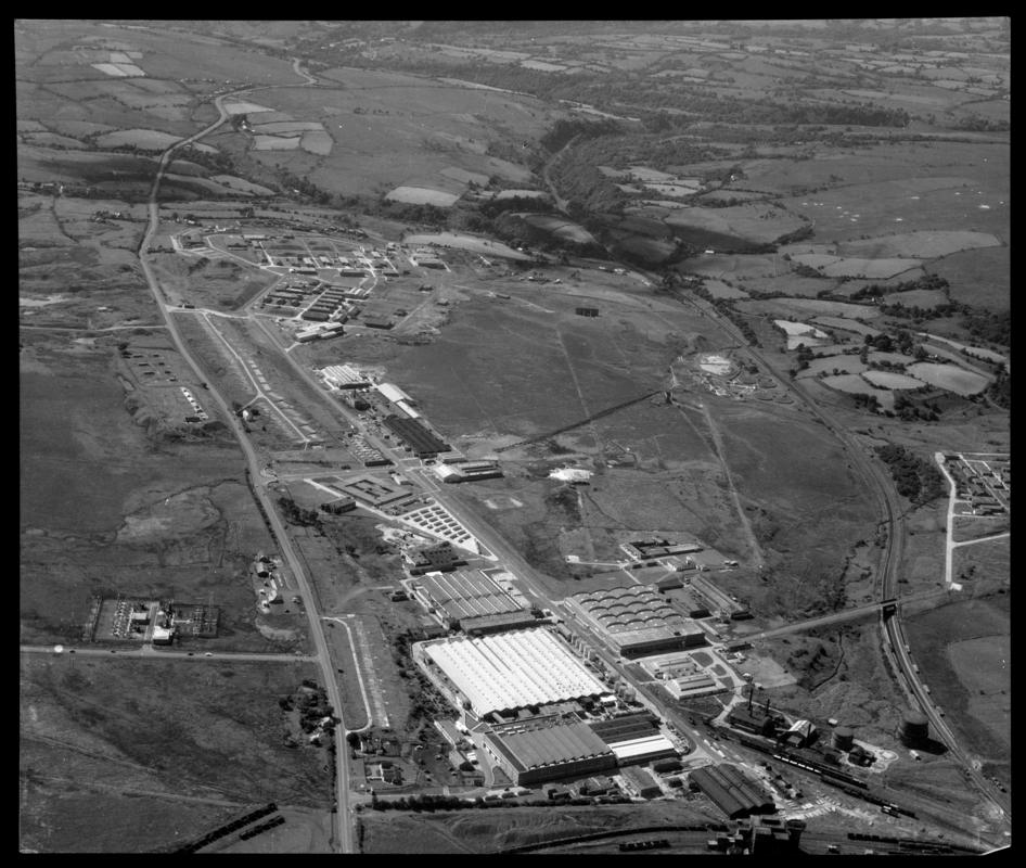 Aerial view of Hirwaun Industrial Estate, showing the Dunlop Rubber factory in the bottom half of the image. Note the coal waste tip, washery and sidings in top half of the image.