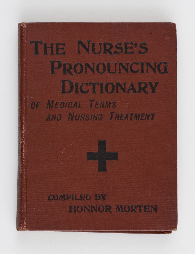 Leather bound pocket dictionary, THE NURSE'S PRONOUNCING DICTIONARY OF MEDICAL TERMS AND NURSING TREATMENT by Honnor Morten. Published in 1904 and used by Muriel Lennox, a VAD nurse and a member of the St John Ambulance Association Barry Nursing Division.