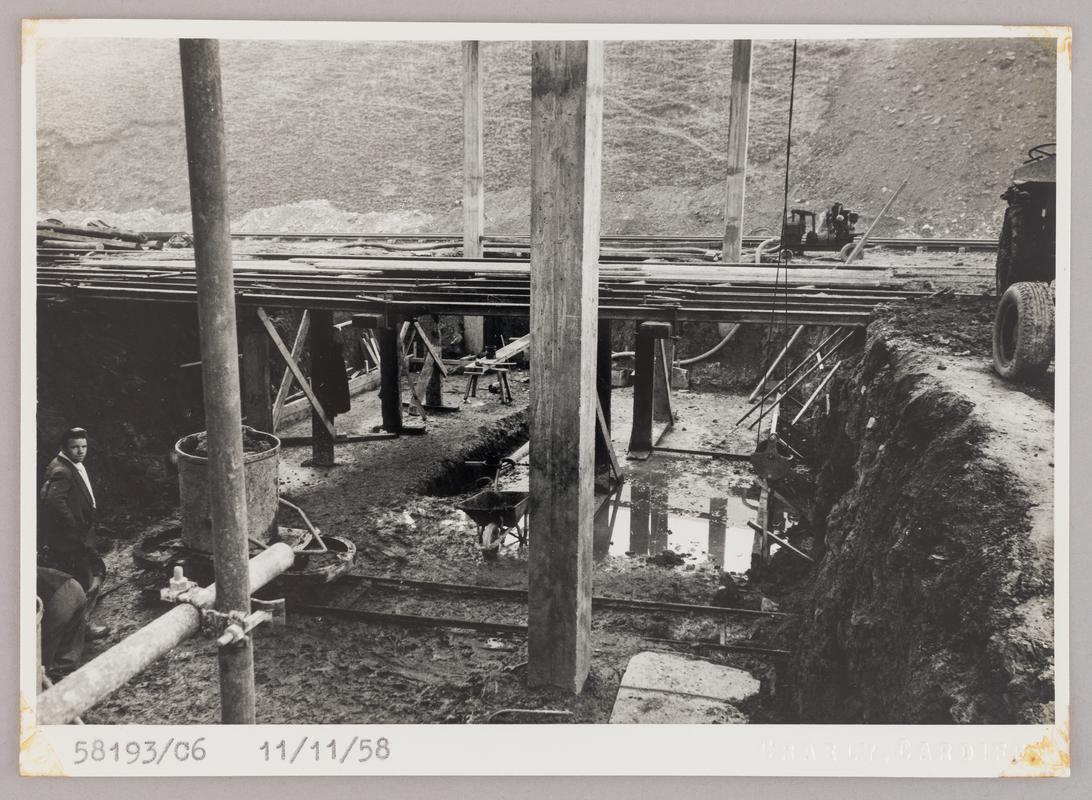 Photograph showing trainees at work erecting collar in roadway in an unknown training centre (probably not Ogmore Vale), 1960's.