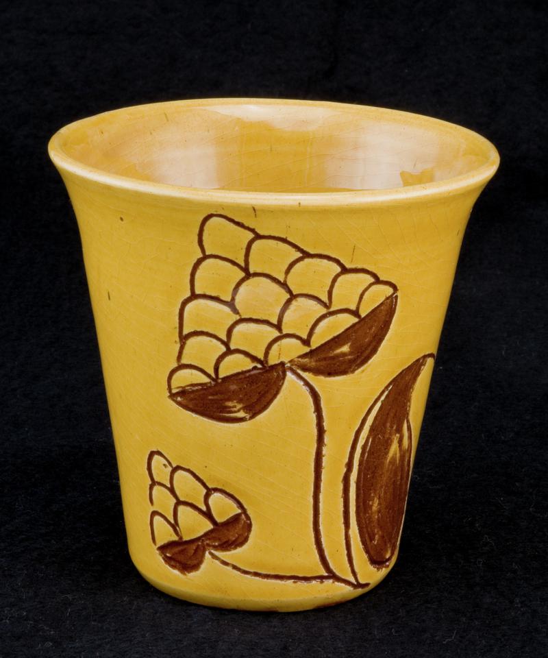 Beer cup, slipware, red earthenware with yellow lead glaze, flat base, flared straight sides curving out slightly to the flat rim; sgraffito decoration of three hop flowers and one tear-shaped leaf.