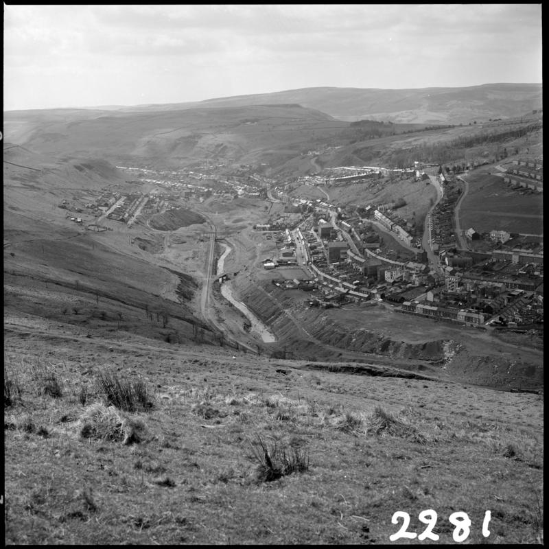 Black and white film negative showing three men aboard the manriding train, Abernant Colliery.
