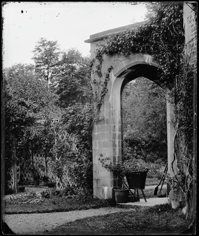 Collodion glass negative. Exterior of Lanelay house with a female figure standing in doorway. Part of sky has been overpainted black.