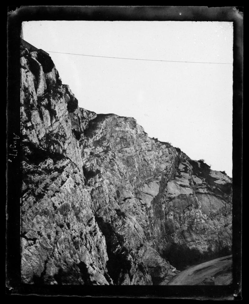 Collodion glass negative. Exterior of Lanelay house with a female figure standing in doorway. Part of sky has been overpainted black.