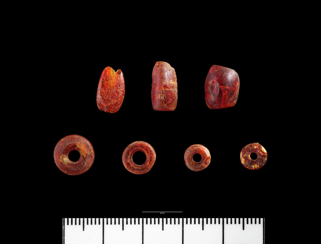 Flattened cylindrical shaped bead that was part of a necklace of amber beads, found close to a pot containing burnt bones.