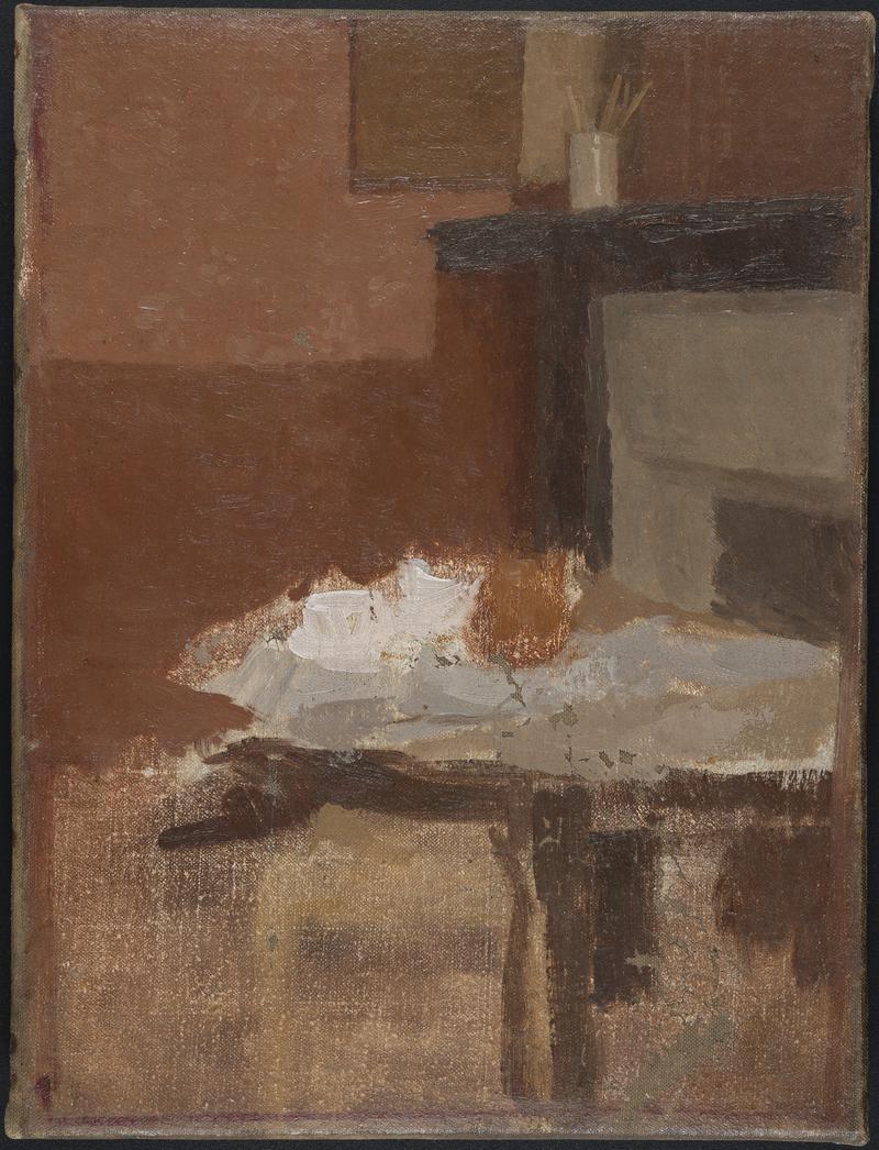 This still life is set in the artist's studio in Meudon in France. Many of the objects in the picture are familiar studio props, such as the round table, the rectangular box and the checked cloth, and they appear frequently in Gwen John's work. However the Japanese doll only appears in this painting and in a second version of it, and introduces a splash of colour into what is otherwise a study of tone. It was acquired by Julia Quinn Anderson, the sister of Gwen John's patron John Quinn, around 1930. She was presumably referring to this work when she commented in a letter to Gwen in July 1928, 'I am sorry that the painting of the doll was not finished'.