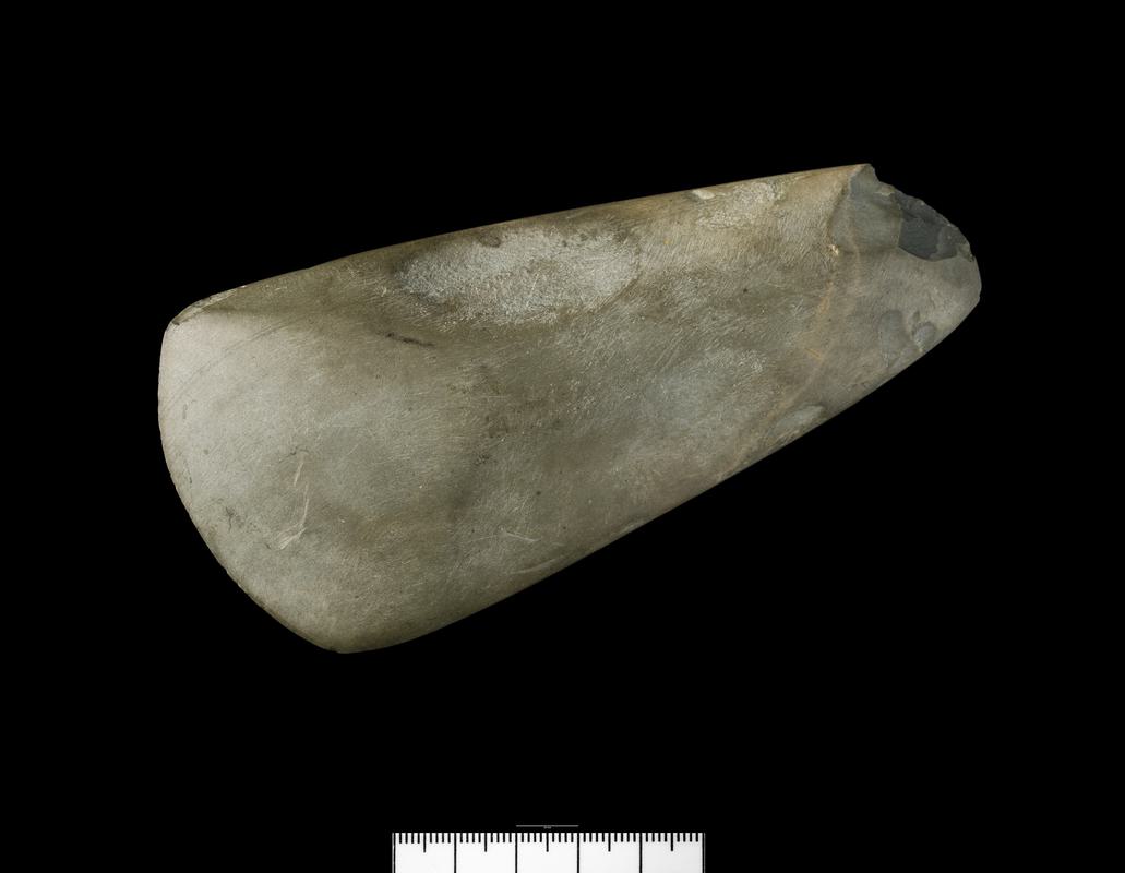 A highly polished axe found at Llangenny, in the Brecon Beacons. Neolithic farmers used fire and hafted stone axes like this to clear woodland. 3800-2500 BCE