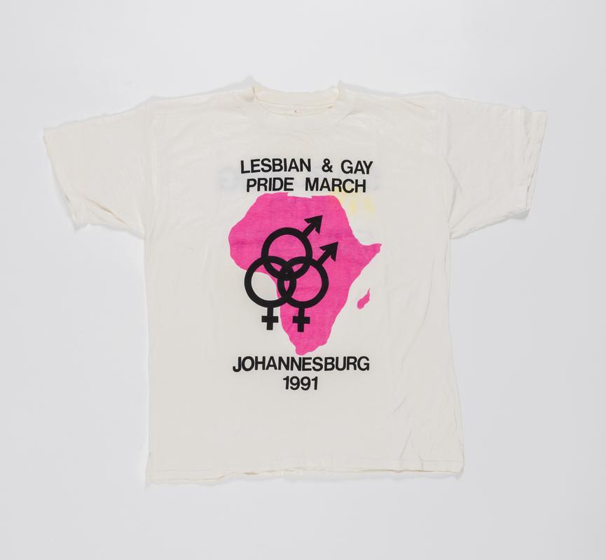 Black t-shirt with gold print showing the Scales of Justice in form of two women. Letters OLGA on right sleeve stands for the Older Lesbian and Gay Association, a South African organisation. Worn at a Pride march in Johannesburg in 1991, and worn later in Wales to highlight the position of lesbians and gay men in South Africa.