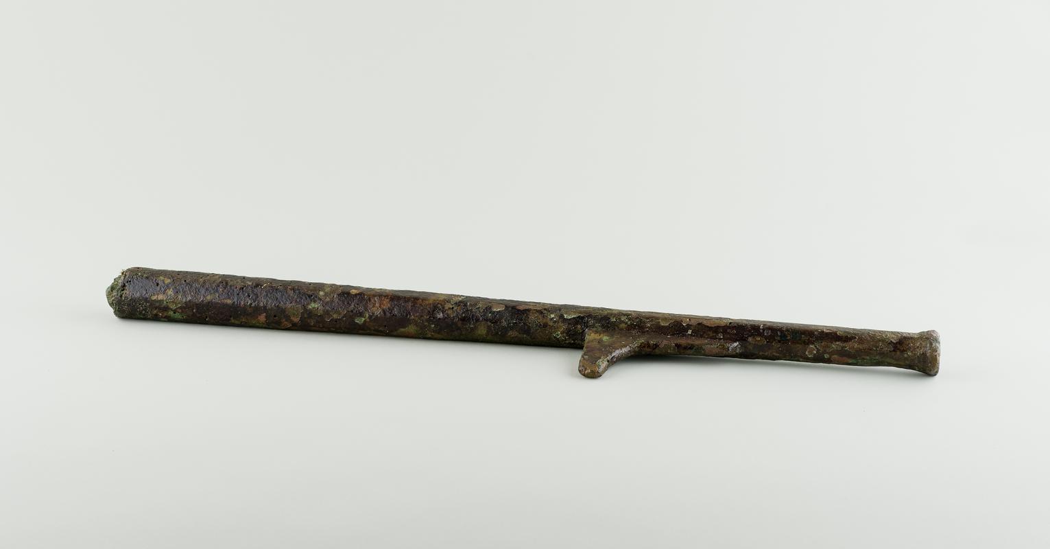 'Christus Rex' with most of one arm and both legs missing. The crown is soldered to the head as a separate piece of metal. There is a round rivet hole in the remaining hand, with traces of blue enamel in the eyes and on the tunic. there also four small wounds placed vertically down his chest with traces of red enamel, and tiny traces in the centre of his robe