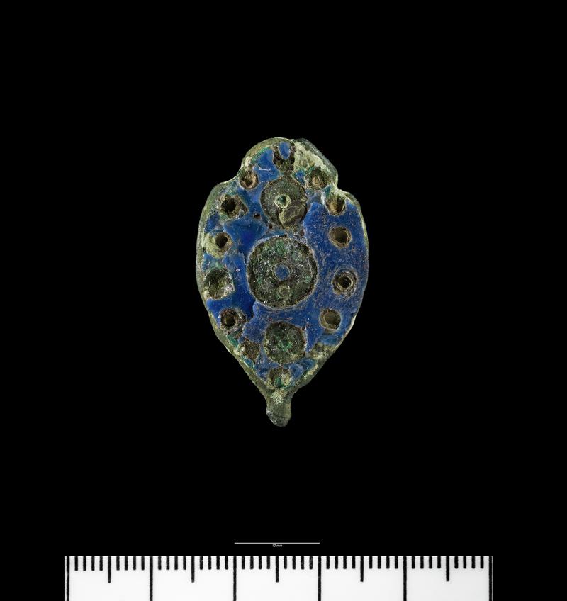 Circular. Body has four round holes, in a square pattern, in its base and two slots in its edge. Lid decorated by a cross formed of five engraved ring-and-dot motifs.