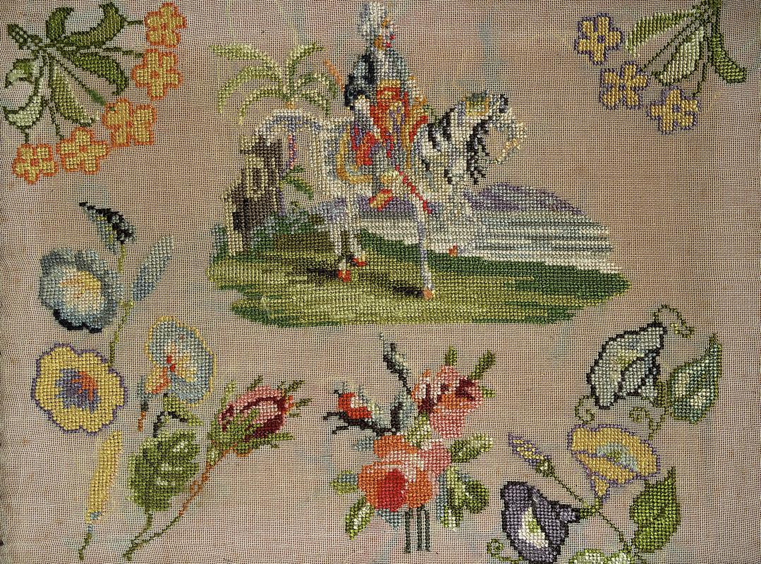 COARSE LINEN CANVAS, embroidered with coloured silks in cross, eyelet, stem, satin, four-sided and back stitches, The upper half has the letters of the alphabet, twice in capitals and once in small letters, and numerals to 10, in nine horizontal rows, separated by straight and zig-zag stripes. Some of the rows are completed with heart, flower and geometric designs. Below is the verse: