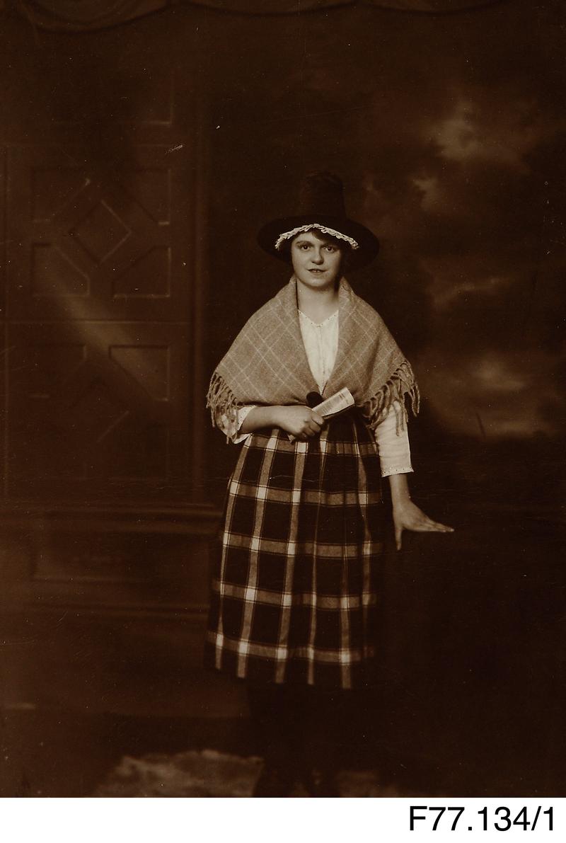 Black and white photograph of a woman in Welsh costume drinking tea.