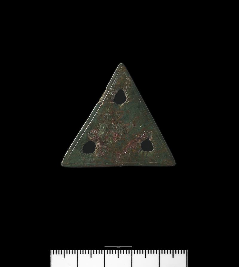 Triangular weaving tablet made of bone. One point of the triangle is missing and the three perforations are roughly bored and exhibit wear from use. 2nd Century AD