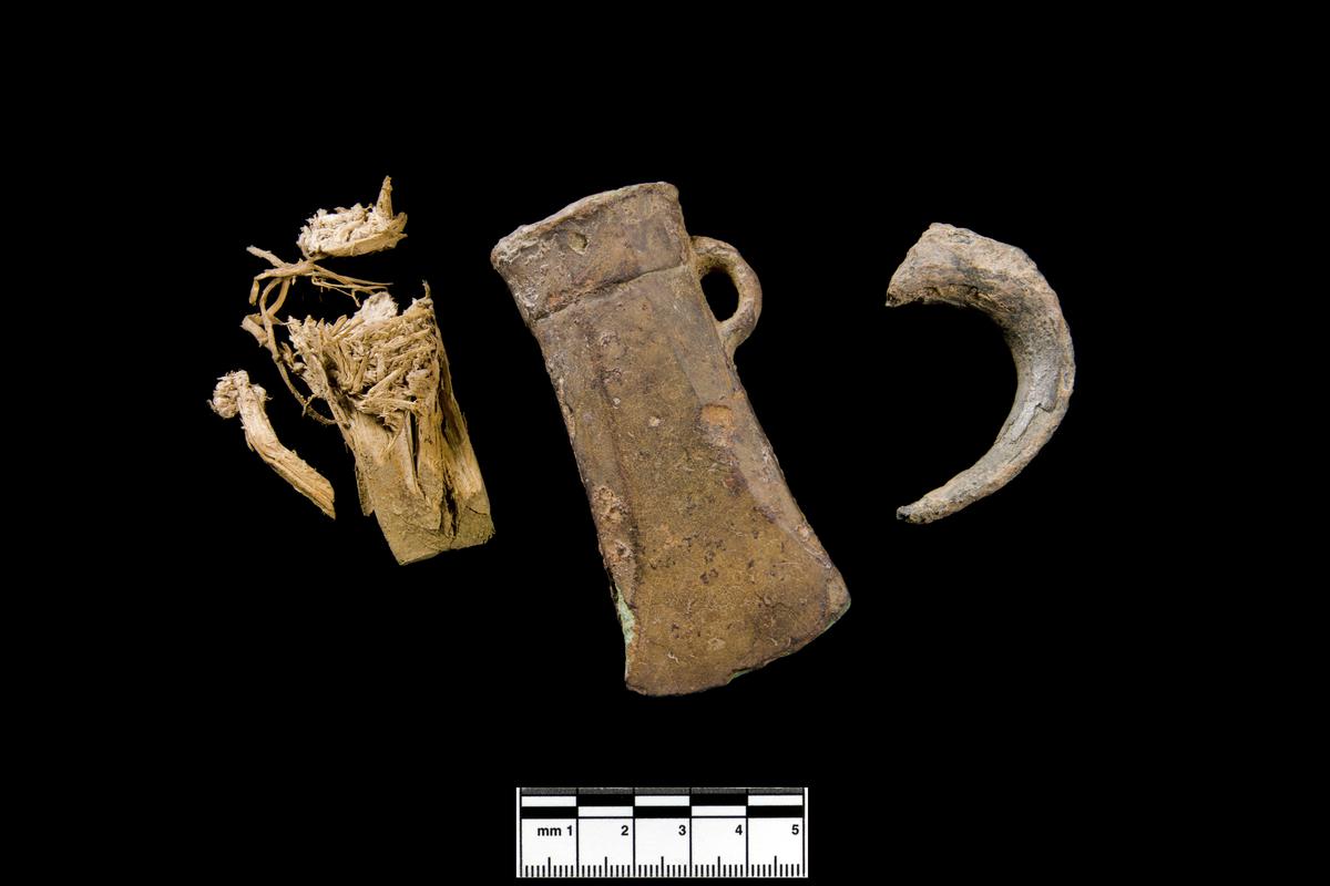 CuA cast fitting, biconcave in side-profile, comprising opposed dished and circular discs, joined by a tapering circular stem. The piece resembles an ‘egg-cup’ or ‘egg-timer’ shape. The top disc is smaller in diameter than the base disc. The base disc has an integral bronze strap across it, sitting within the dished surface and not projecting above the dish margins. The artefact has an irregular appearance, the upper disc being slightly offset from the centre of the base and the top surface tilting slightly off the horizontal. There are no visible wear facets around the central stem or on the disc surfaces. There is a casting flaw on the top surface of the base disc (i.e. non-strap side). Though very similar in form to number 1 above (so as to indicate a similar function), it is smaller and more slender. Wagon fitting (terminal) or harness fitting – unpublished parallel described as a button fitting from Moel y Gaer hillfort, which is smaller than both examples from Llanmaes. Further parallels from Hohenwalde in Poland: 326 small examples published as buttons, some with bird heads, others with circular heads, associated with three fragments of gold torc. Dated to Halstatt B2/3, equating with the British Ewart Park period.