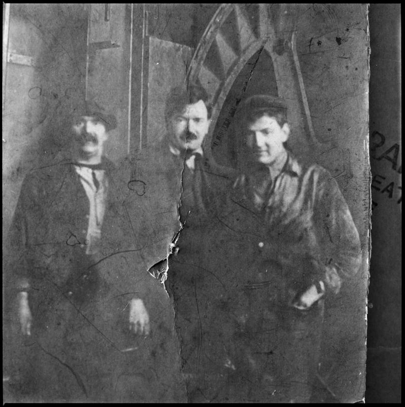 Black and white film negative of a photograph showing a 0-6-0 tank engine with a police guard during a strike, Deep Navigation Colliery.
