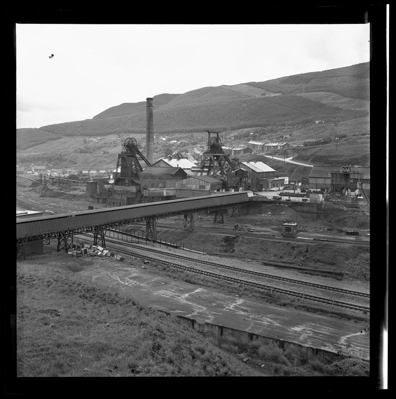 Black and white film negative of a photograph showing the scene at Universal Colliery, Senghenydd after the explosion of 14 October 1913. Caption on photograph reads 'the Welsh Pit disaster where over 400 miners were entombed, Tuesday October 14th 1913. Scene after the second fire broke out'. 'Senghenydd' is transcribed from original negative bag.