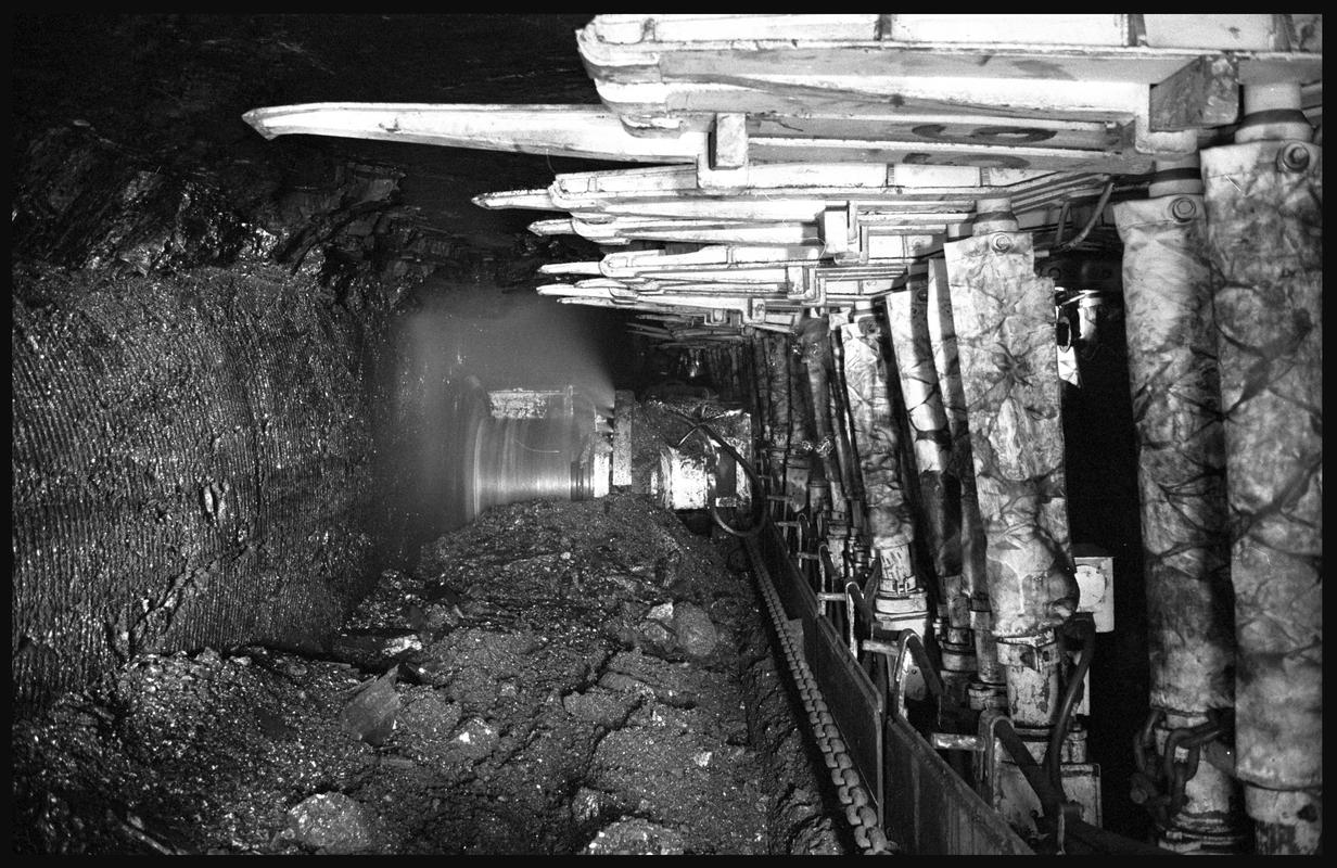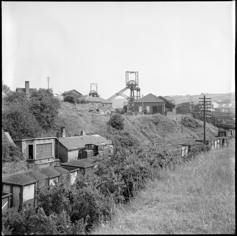 Black and white film negative showing the small lattice headframe on the House Coal Shaft, 1975.