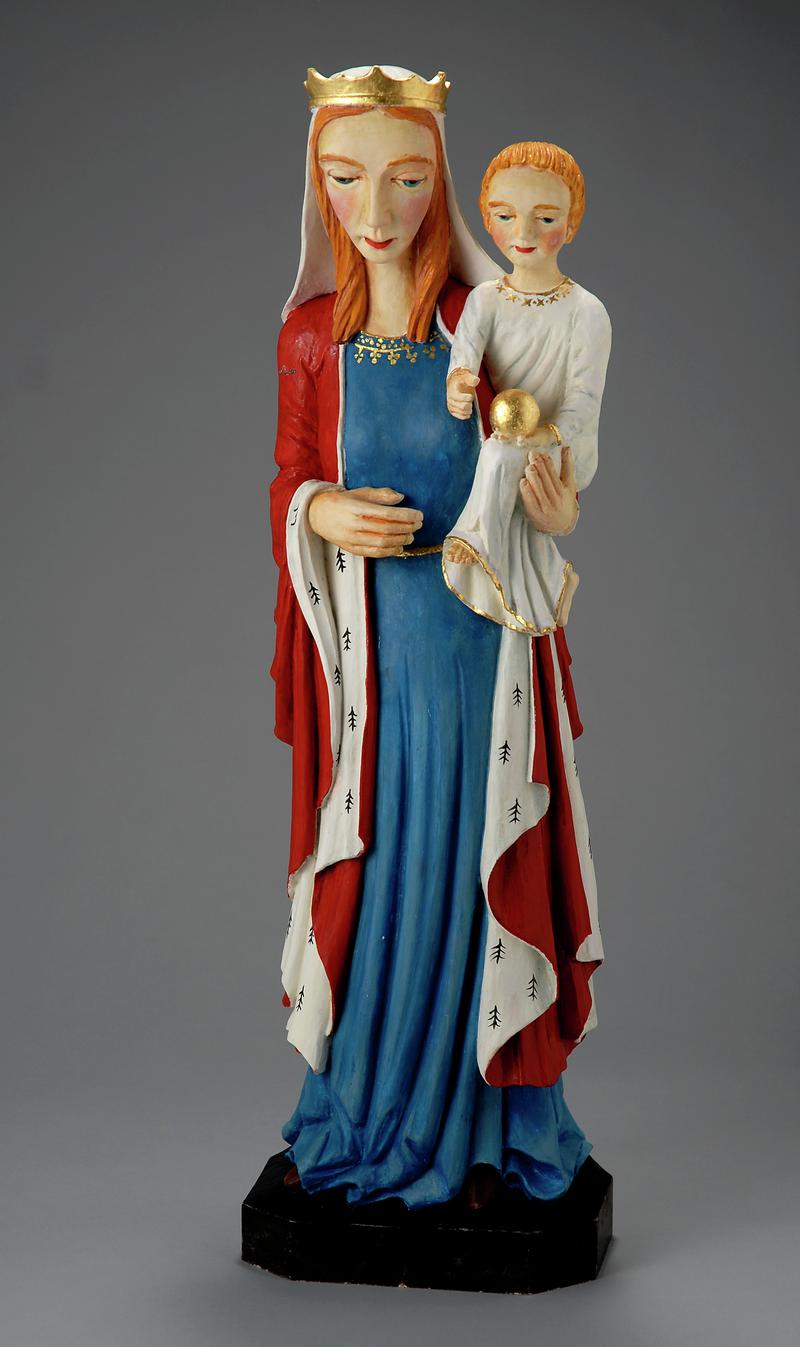 Carving of St Teilo based on medieval examples surviving at (e.g.) Daoulas Abbey and St Telo/Thelau’s church in Landelo/Landeleau, Britanny. The statue was carved from oak by master carver Emyr Hughes (from Llangollen, now living in Gloucestershire). It shows St Teilo dressed as a bishop seated on a stag with his right hand raised in blessing and holding a crozier in his left. The statue was painted by Fleur Kelly from Mells, Nr Frome, Somerset, using natural pigments and gold leaf.