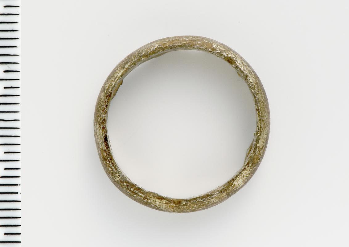 Fragment of fede ring. The hoop appears to have been of flattened D-shaped cross-section. The outer surface of the hoop is cast with clasped hands around a heart. The flat inner face is engraved in Roman capitals with the letters T I [. (possibly M, N or R; the rest of the inscription is missing).