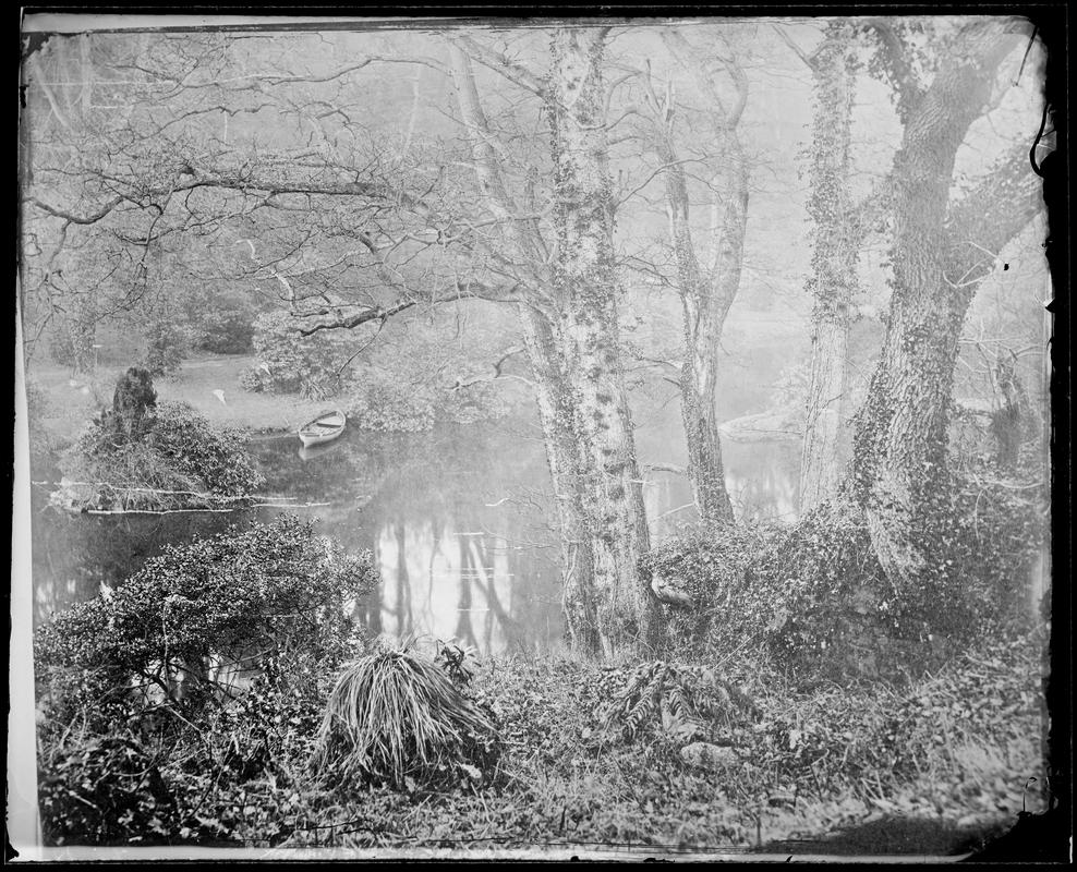 Calotype (negative) with no tabs at corners. Unwaxed. River running through dense woodland. Probably taken on the Penllergaer estate or the Dulais Valley vicinity.