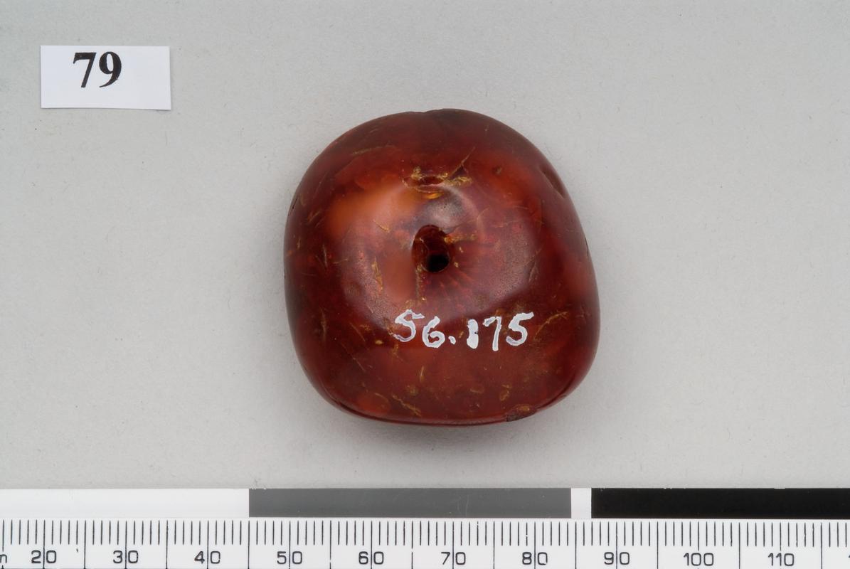 Circular bead with slightly wedge-shaped cross that suggests it may originally have been part of graduated necklace of several other beads. It was found just 1m away from the star-shaped faience bead (92.46H/321) within the Late Bronze Age rampart at The Breiddin hillfort. It is possible that they were originally from the same necklace, perhaps from an Early Bronze Age burial that was disturbed when the hillfort was constructed in the 10-9th centuries BCE. However, amber beads are also used and buried into the Late Bronze Age (1150-800 BCE) and so a later date remains a possibility.